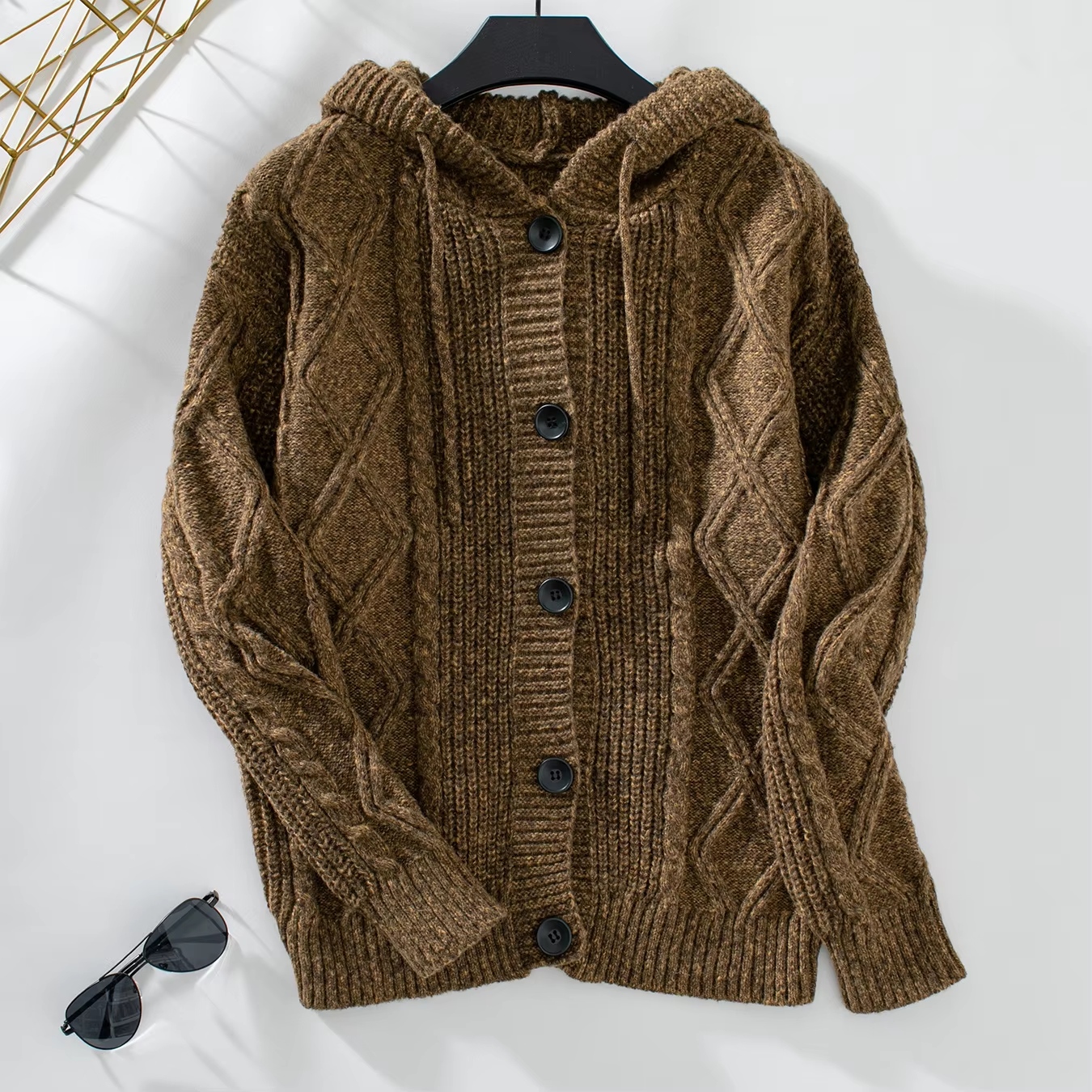 Hooded Drawstring Knit Cardigan Autumn and Winter New Twist Sweater Women’s Solid Color Medium Long Coat