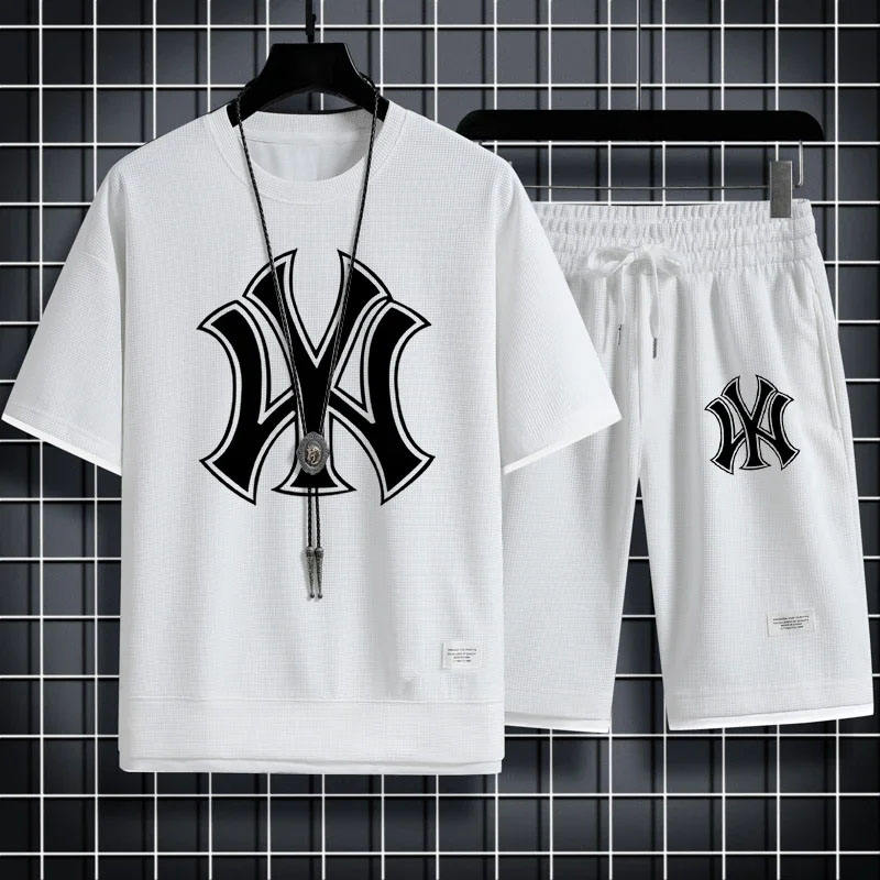 Summer Fashion Men’s Waffle Short Sleeve Set+Sports Pants 2-piece Set with Comfortable Texture and Fabric